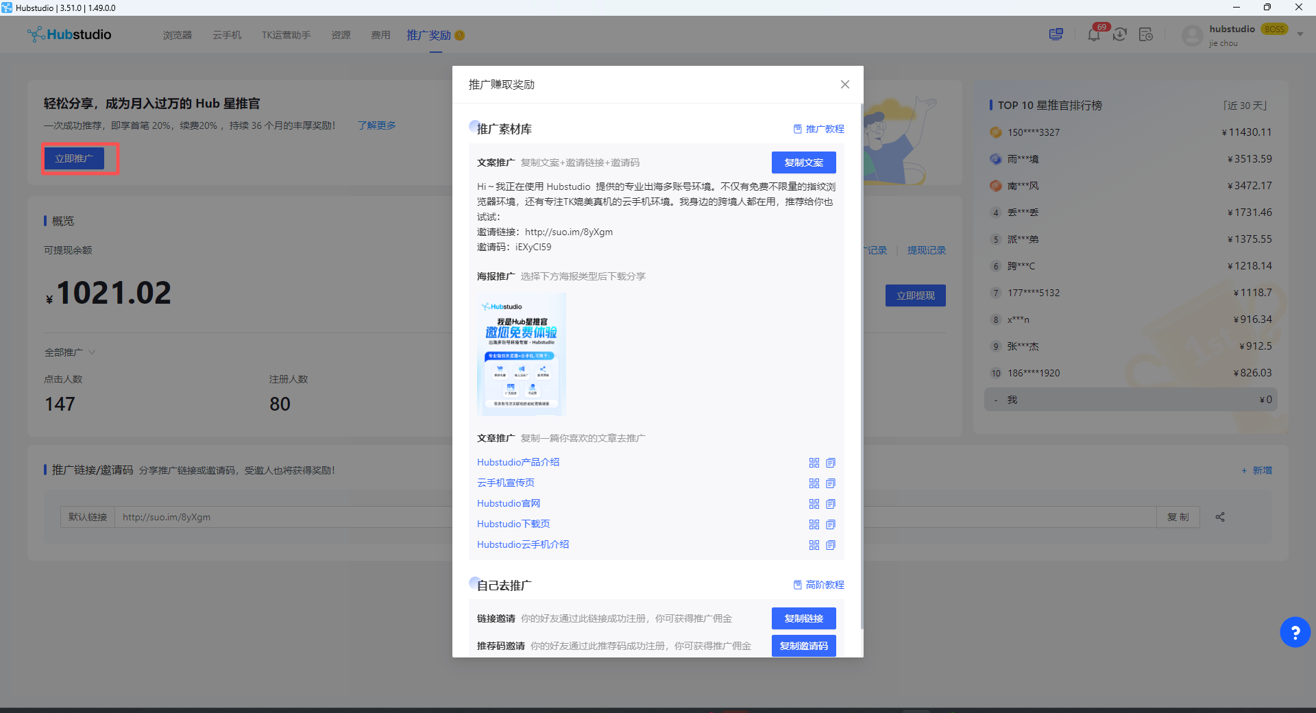5.1.入口路径:先登录进入「推广奖励平台」点击「立即推广赚取奖励」,Hubstudio官方已经为您准备了推广素材,可以获取专属您的推广素材(直接邀请,图片邀请,文章邀请)