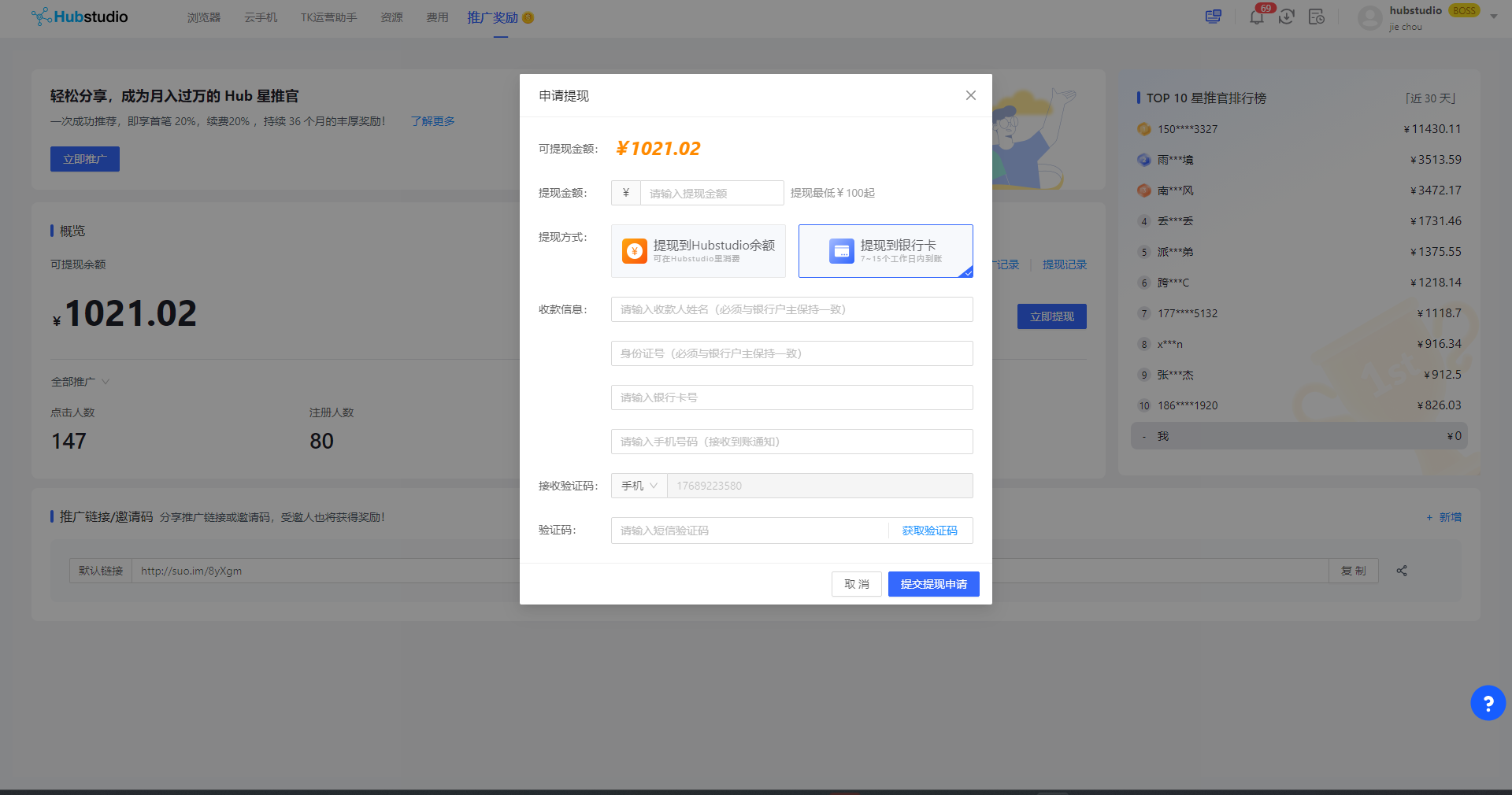 6.1.支持提现方式:目前支持提现的Hubstudio余额(推广者为boss的团队)和提现到银行卡