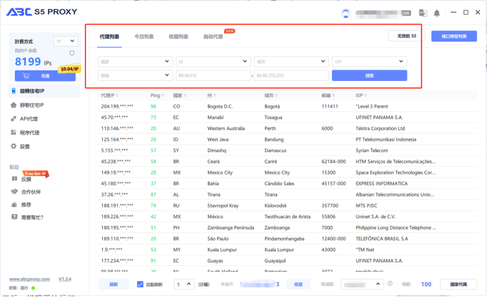 3、按国家/地区/邮编过滤,你可以根据你需要的国家、城市、邮编等过滤IP。或者点击 "搜索 "来获得目标地区的IP列表。