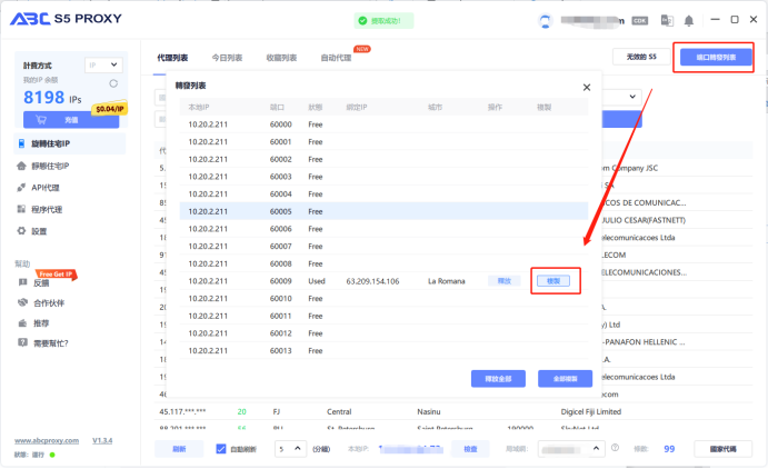 5、点击 "端口转发列表 "按钮,查看详细的代理参数。点击 "复制 "按钮,一键复制本地IP和端口。要释放端口,点击 "Free "按钮界面。