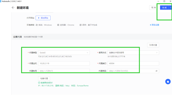 6、打开Hubstudio客户端,点击“新建环境”,填写socks5代理信息,点击检测代理,代理检测通过,点击完成。