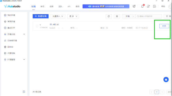7、在环境列表点击打开就可以使用了,即可代理成功。