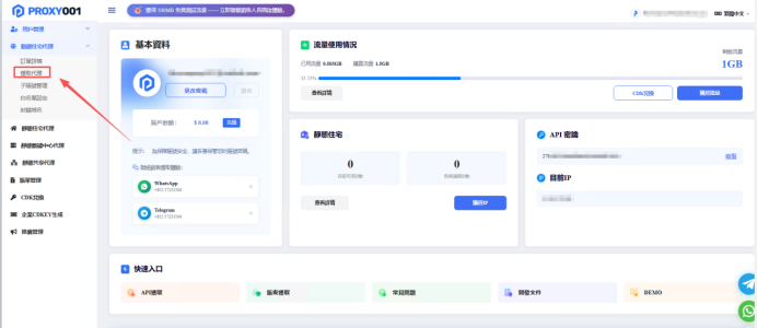 1.打开Proxy001官网:https://proxy001.com/?aff=brown_hubstudio_tutorial;完成注册登录并领取500M 流量!