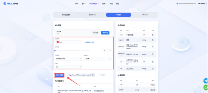 4. 然后根据自己的需求选择国家/地区、代理协议、输出格式,点击生成API链接