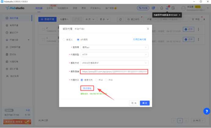 5. 复制链接内容,下面打开Hubstudio并新建浏览器窗口;输入从Proxy001获取的API链接!