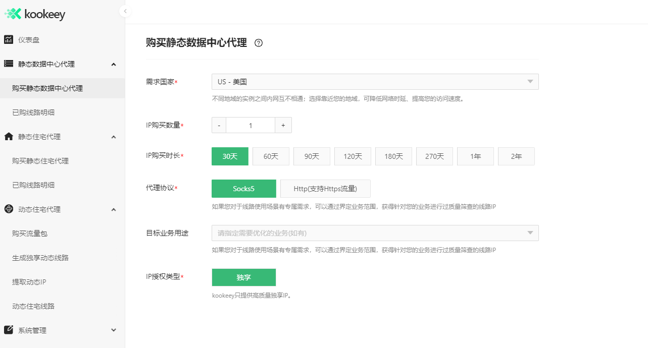 2.2.选择国家,IP购买数量,以及购买时长和代理协议类型