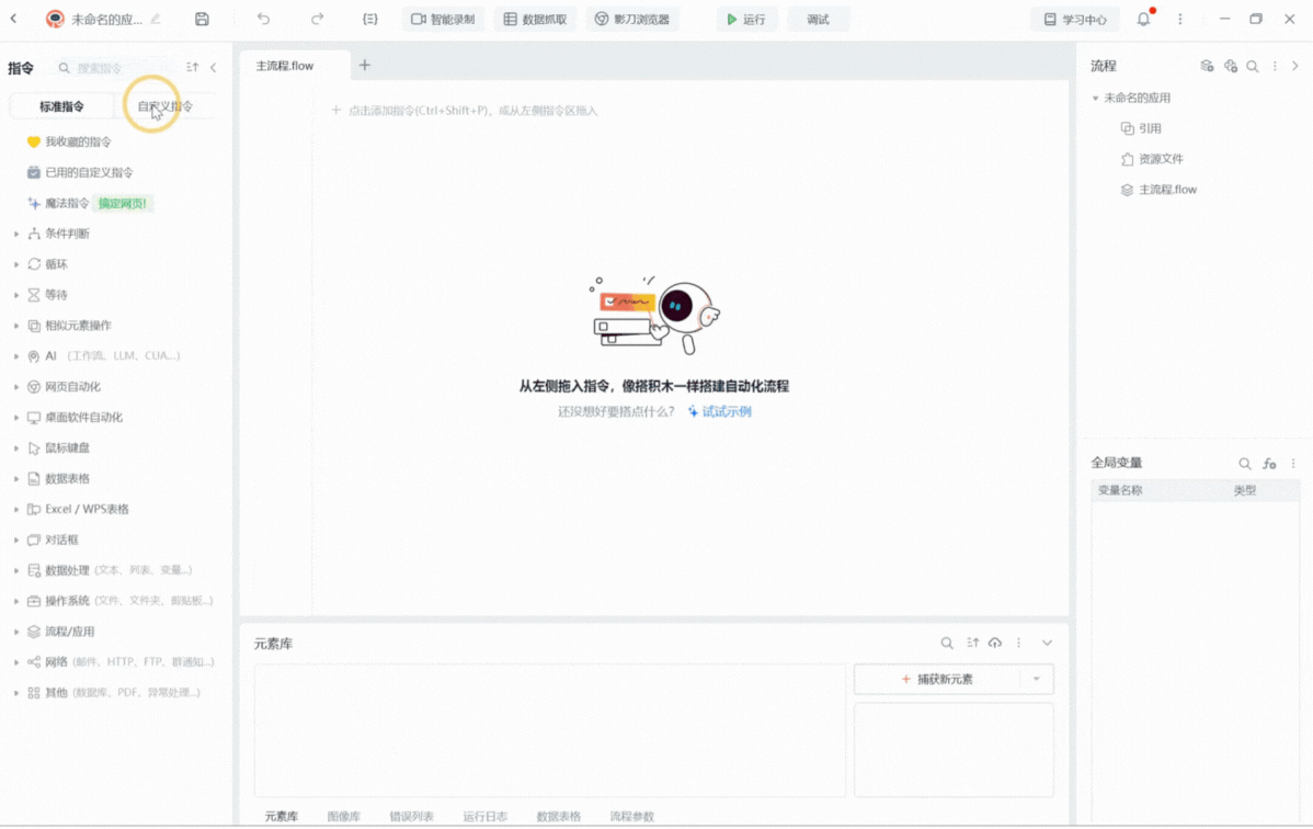 - 打开影刀 RPA 软件,点击左侧导航栏的 「自定义指令」 模块;